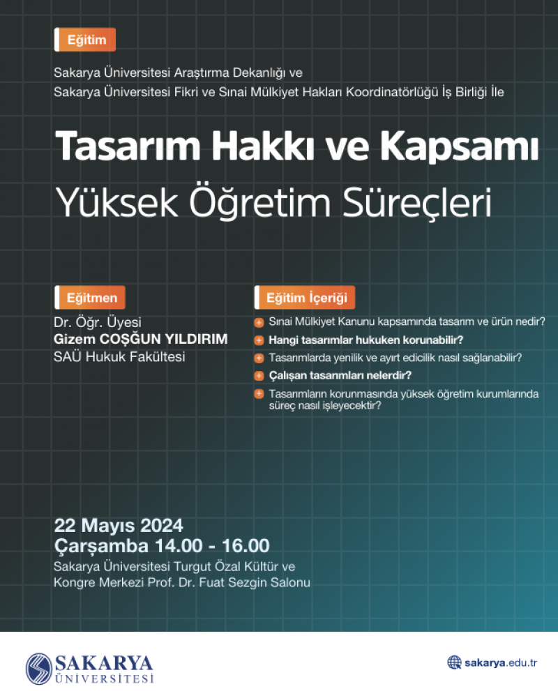 Eğitim kapsamında  SAÜ Hukuk Fakültesi Öğretim Üyesi Dr. Öğr. Üyesi Gizem COŞĞUN YILDIRIM sınai mülkiyet kanunu kapsamında tasarımdan üniversitemizdeki süreçlere kadar çeşitli başlıklarda bilgi verecektir.